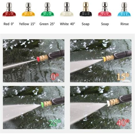 【7 DIFFÉRENTS CONSEILS DE BUSE DE PULVÉRISATION 】 L’ensemble d’embouts de lavage sous pression est en acier inoxydable ou en laiton. Rouge-0° et jaune -15° et vert -25° et blanc ite-40° & ; Savon noir et rose & Bleu-Risen. Différents angles de pulvérisation vous permettent de nettoyer rapidement et facilement les zones difficiles d’accès