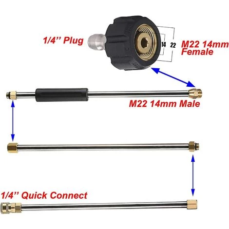 Filetage mâle M22 14 mm. L’extrémité peut passer à une fiche de raccordement rapide 1/4 » avec coupleur inclus.