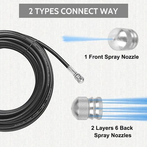 buse avant et 6 buses arrières] la buse à jet est fabriquée en acier inoxydable, anti-rouille, anti-corrosion et durable. Cette buse dispose de 7 jets. À l’avant, il dispose d’un angle de pulvérisation de 0°, puis de 6 jets en 2 couches à l’arrière. Cette buse peut pulvériser loin. Le puissant spray aide à nettoyer facilement et rapidement vos canalisations, canalisations et gouttières bouchées.
