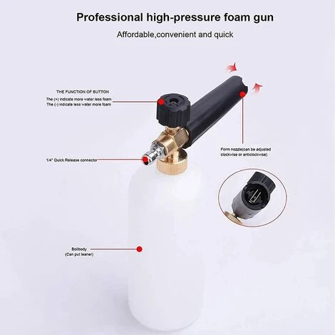 【Réglable】 l’écrou total supérieur de ce canon à mousse à neige peut être tourné pour ajuster l’épaisseur du doam. La mousse peut être pulvérisée dans un motif en forme d’éventail décent ou un motif cylindrique.
