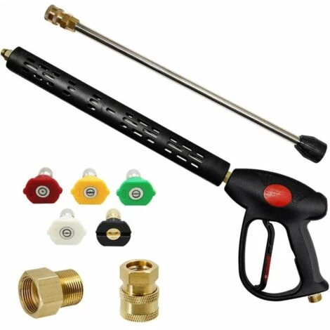 Humanisation?Conception?: Assemblez des pistolets de nettoyeur haute pression longs ou courts selon vos besoins. Trois longueurs : 40 po, 25 po et 8,8 po. Notre pistolet à gachette de remplacement pour nettoyeur haute pression s’adapte à la plupart des nettoyeurs haute pression à essence et électriques avec raccord M22. Le pistolet a une gachette de verrouillage de sécurité pour éviter les jets accidentels. Poignée con?ue plus confortable et meilleure prise en main.