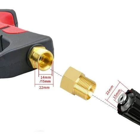 – Le connecteur universel en laiton M22 peut résoudre le problème d’incompatibilité entre le pistolet de nettoyage à pression mâle M22 de 14 mm et le tuyau de nettoyeur haute pression M22 de 15 mm.
