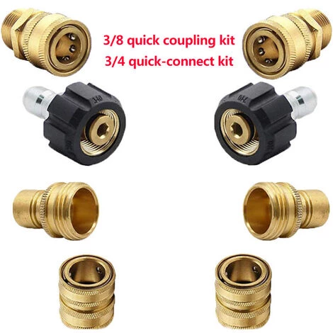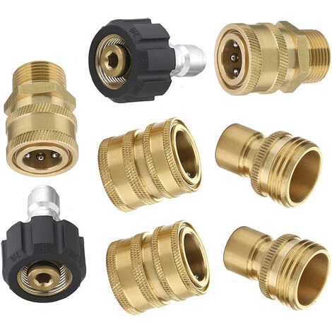 Ensemble d’adaptateurs de rondelle HT à usage général de 8 pièces avec 4 coupleurs comprenant: tête femelle rotative métrique M22-14 + fiche 3/8 pouce, déconnexion rapide 3/8 pouce + tête mâle M22, tête femelle 3/4 pouce + 1/2 pouce connexion rapide, fiche 1/2 pouce + tête mâle 3/4 pouce.