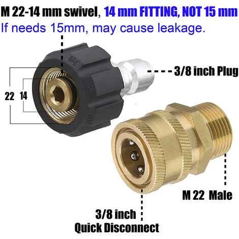Le diamètre intérieur du joint tournant M22 14 est de 14 mm et non de 15 mm. Ne remplace pas la machine de nettoyage électrique haute pression Sun Joe, Campbell, MI-TM, AR Blue, Stanley, Cleanforce, Simoniz. Si le lave-linge a besoin de 15 mm, cela peut provoquer une fuite.