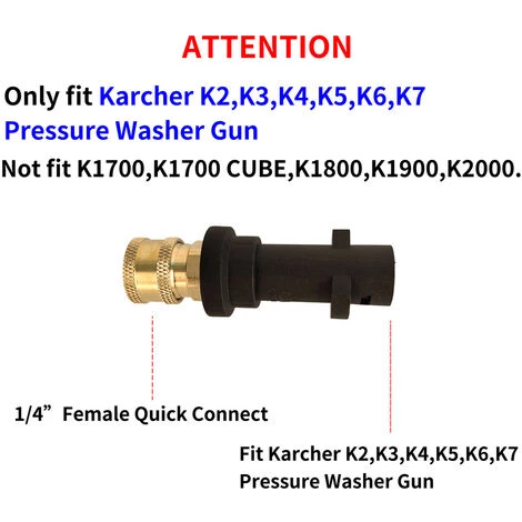 Attention : convient uniquement aux pistolets de nettoyeur haute pression Karcher K2, K3, K4, K5, K6, K7 et Stanley SLP. Ne convient pas aux modèles K1700, K1700 CUBE, K1800, K1900. K2000. Ne convient pas aux nettoyeurs haute pression Karcher série K fabriqués après l’année 2010.