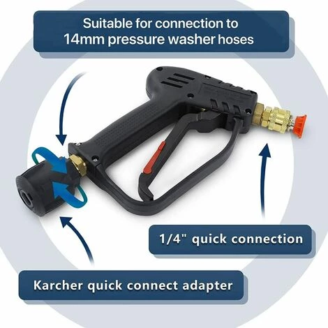 Le pistolet de pulvérisation de l’autolaveuse dispose d’un adaptateur à connexion rapide et d’un connecteur M22 (14 mm). La tête du pistolet est un connecteur rapide de 1/4 de pouce. L’accessoire noir est l’adaptateur. Il est facile à utiliser et détachable. Il peut être facilement installé sur le pistolet de pulvérisation Karcher Quick Connect.