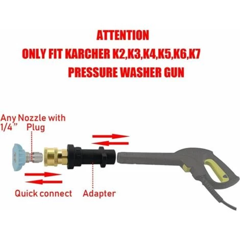 - Le forfait comprend : 1 adaptateur de pistolet pour nettoyeur haute pression 1/4″À utiliser uniquement avec les pistolets de nettoyeur haute pression Karcher K2, K3, K4, K5, K6, K7 et Stanley SLP. Ne s’applique pas aux K1700, K1700 CUBE, K1800, K1900, K2000.
