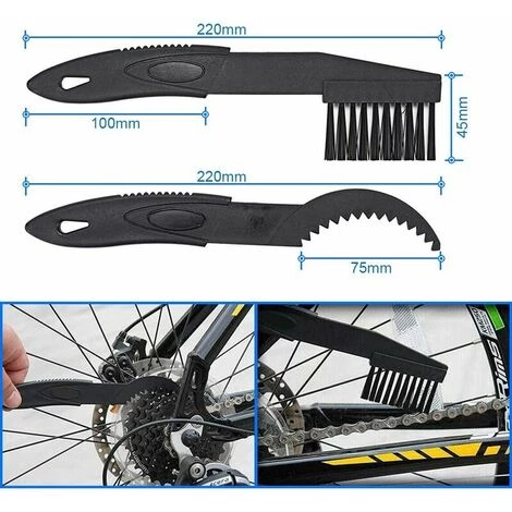 - Taille 10 pouces / 25,5 cm de long, 2,4 pouces / 6 cm au point le plus large et 1,3 pouces / 3,2 cm de large. L’outil de nettoyage dentĂ© gratte la saletĂ© grossière des coins et les fissures sur la plaque d’engrenage, puis la saletĂ© dĂ©tachĂ©e peut ĂŞtre enlevĂ©e avec la brosse. La brosse nettoyante pour cha?ne de moto / vĂ©lo pèse: 85 g.