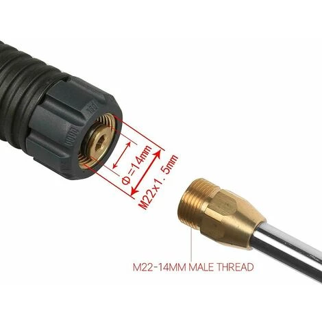 Universal 1/4″ Connecteurs rapides et filetage mâle M22 x 14 mm, la baguette s’adapte à la plupart des pulvérisateurs de nettoyeur haute pression.