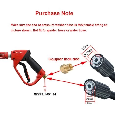 Fabriqué en acier inoxydable et cuivre, avec une poignée de pistolet, une baguette de pistolet de 15 pouces, une baguette de nettoyeur haute pression de 16,5 pouces, 5 embouts de buse de pulvérisation, un connecteur M22 14 mm femelle à M22 15 mm mâle, un connecteur rapide M22 14 mm femelle à 1/4 pouce et 5 O -anneaux.