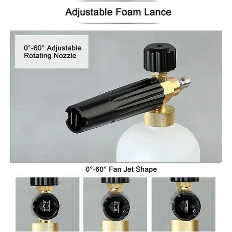 Réglable: L’écrou rotatif supérieur de la lance à mousse de neige peut ajuster l’épaisseur de la mousse. La buse rotative du distributeur de savon peut ajuster la forme de pulvérisation d’un motif cylindrique de 0° à un motif en éventail décent à 60°.