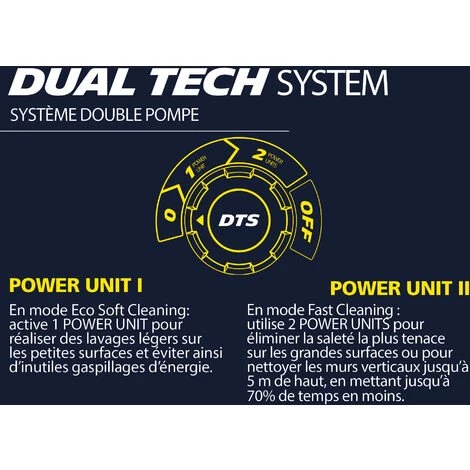 MPX25DTS est un nettoyeur haute pression pour la maison, solide et robuste, avec plus du double de performance par rapport à un traditionnel nettoyeur Home & Garden. Son équipement de série inclut un grand nombre d’accessoires. La boîte contient : un pistolet avec sécurité, une lance et un flexible à Haute Pression hyper souple de 8 m qui donne une très grande liberté de mouvement ; un adaptateur Twin Nozzle ; 2 rotabuses pour éliminer la saleté la plus tenace et la plus incrustée ; 1 buse à jet réglable qui permet de modifier la largeur du jet d’eau pour le faire passer de cylindrique (plus intense et concentré) à éventail (plus délicat et recommandé pour le rinçage) ; 1 kit canon à mousse haute pression raccordable au pistolet pour répartir le détergent de façon plus efficace et rapide qu’un kit basse pression. Le câble électrique a une longueur de 5 mètres.Les deux roues en caoutchouc de 20 cm de diamètre et la poignée ergonomique en font un nettoyeur haute pression maniable et simple à déplacer. Après emploi, les accessoires se rangent dans les compartiments aménagés au dos de l’appareil, alors que le flexible à haute pression s’enroule parfaitement grâce à l’enrouleur intégré.MPX2525DTS comporte un filtre entrée d’eau contrôlable qui retient les éventuelles impuretés et le Total Stop System. Ce dernier coupe automatiquement le nettoyeur dès que la gâchette du pistolet est relâchée. Le nettoyeur est ainsi exposé à une usure moindre, consomme moins d’électricité et dure plus longtemps. Le moteur redémarre dès que la gâchette du pistolet est enfoncée.La boîte contient le manuel avec la liste des centres d’assistance implantés sur le territoire. La durée de la garantie est de 2 ans à compter de la date d’achat.PLUS•Nettoyeur haute pression à eau froide avec l’exclusif Dualtech System comportant la présence de 2 unités pompe-moteur. Possibilité d’activer un seule unité pompe-moteur ou les deux pour augmenter de plus de 50 % la performance par rapport à un traditionnel nettoyeur Home & Garden•En mode Fast Cleaning (2 POWER UNITS), le débit de l’eau grimpe à 850 l/h (plus du double d’un habituel nettoyeur pour la maison) pour éliminer, sans efforts et plus vite, la saleté la plus tenace sur les grandes surfaces ou pour nettoyer les murs verticaux jusqu’à 5 m de haut•Le mode Eco Soft Cleaning (1 POWER UNIT) est recommandé pour réaliser des lavages légers sur les petites surfaces et éviter ainsi d’inutiles gaspillages d’énergie•Le nettoyeur est livré avec le révolutionnaire adaptateur TWIN NOZZLE à appliquer à la lance : deux buses peuvent y être installées pour doubler la surface lavée et pour nettoyer la même superficie en mettant jusqu’à 70 % de temps en moins•Pression (bar) max. 150 ; Puissance absorbée (kW) 2,5 ; Débit (l/h) max. 810 ; Température eau d’alimentation (°C) max. 50