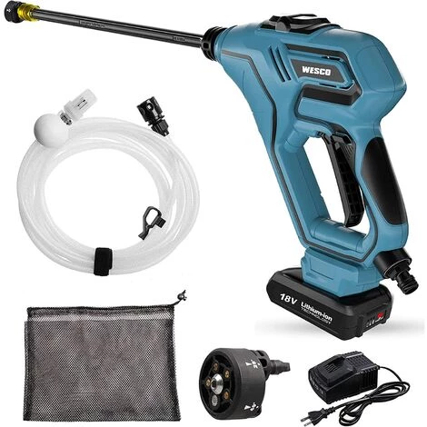 - LE COLIS CONTIENT: 1xWESCO Nettoyeur haute pression sans fil, 1 X tuyau de 6 m, 4 x buse de pulvérisation, 1 x sac de transport, 1 x lance d’extension, 1 x batterie (WS9935), 1 x chargeur (WS9854); Garantie de 2 ans.