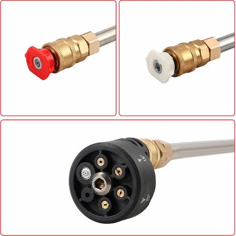 - 1. Buse multifonction 6 en 1 : Le nettoyeur haute pression dispose de 6 modèles de buse différents : 0°, 15°, 25°, 40°, diagonale et douche. Vous pouvez faire pivoter la buse librement pour l’ajuster en fonction de votre mode, ce qui permet d’économiser beaucoup d’eau. De plus, nous proposons également une buse avec un réservoir de détergent.