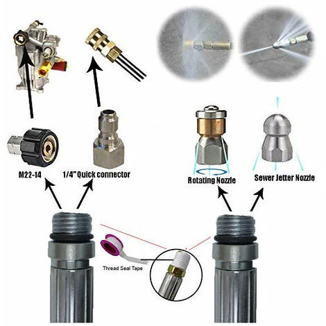 【Kit de jetter de conduit de nettoyeur haute pression】 Comprend un tuyau de sablage de conduit, une buse de sablage de conduit laser (nez de bouton), une buse de sablage de conduit rotative et un connecteur à dégagement rapide de 1/4 po La pression de service est de 18 Mbar / 180 Bar / 2610 PSI. La pression d’éclatement est de 7830 PSI.