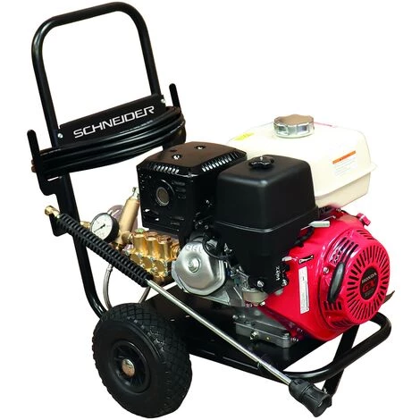 – pistolet HP avec raccord à visser (côté lance) – lance simple 700mm à tête réglable avec buse jet plat. – flexible tressé 10m – roues gonflables diam 260mm – Raccord à billes en sortie de pompe