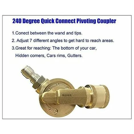 Applicable à divers endroits : le coupleur de pivot coudé vous offre des endroits pratiques et propres qui sont difficiles à atteindre, tels que le châssis et la jante de l’automobile, vous pouvez également l’ajuster à un angle approprié pour nettoyer les égouts. En outre, vous pouvez l’utiliser pour un usage quotidien, arroser les plantes, nettoyer les canalisations, les avant-toits et les murs.