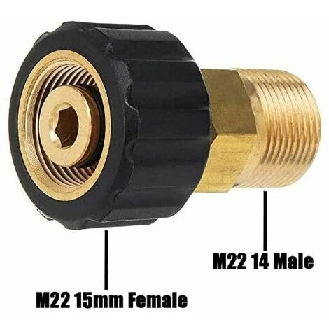 – Le coupleur de nettoyeur haute pression M22 14 mm mâle à M22 15 mm femelle est utilisé pour connecter le connecteur femelle M22 14 mm au pistolet, tuyaux, nettoyeur haute pression ou raccords M22 15 mm mâle.< /p>
