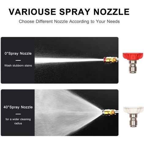BUSE À PRESSION RICHE – Livrée avec une buse à 0 ° pour un rinçage long et puissant ou un arrosage du jardin, et une buse à 40 ° pour un lavage de surface de voiture à large plage, un nettoyage de voiture rapide et sans effort.