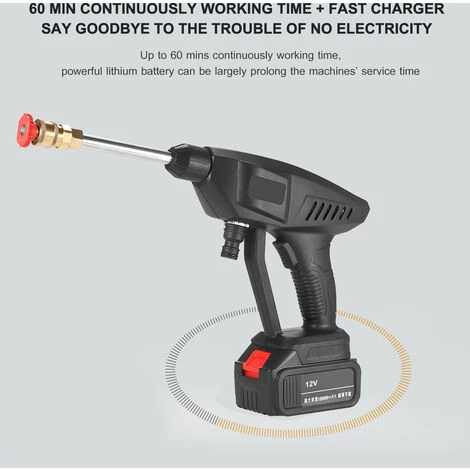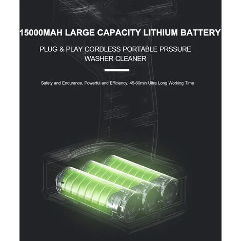 Puissant nettoyeur haute pression portable à moteur en cuivre 12 V 15 000 mAh alimenté par batterie au lithium ; Corps de pistolet de pulvérisation d’eau sans fil léger et compact avec filtration Un tuyau d’arrosage de 5 m de long permet de puiser n’importe quelle source d’eau douce pour un nettoyage et un entretien extérieurs sans effort, une double filtration en profondeur des impuretés dans l’eau, une pompe de protection, des machines prolongées & # 39; temps de service. Avec une pression parfaite, il est idéal pour les travaux de nettoyage plus lourds mais routiniers. tels que le lavage de voiture, le nettoyage de pont, le dégraissant ou l’arrosage de jardin, etc. qui est 3 fois plus de pression que le tuyau d’arrosage avec buse, permet d’effectuer des travaux de nettoyage plus lourds, tels que le lavage de voiture, le nettoyage de pont, le dégraissant ou l’arrosage de jardin, etc. 45 à 60 minutes de fonctionnement continu, plug and play, ne soyez plus limité par le cordon. La batterie à très longue endurance vous apporte non seulement une méthode de travail pratique, mais prolonge également le temps de service du pistolet de pulvérisation. où, source d’eau comme une piscine, un lac ou un seau. Vous pouvez brancher un tuyau d’arrosage à la maison ou même une bouteille de 2L en déplacement. La boîte de filtration pour tuyau à haute efficacité et filtration profonde, qui peut protéger la pompe et prolonger sa durée de service.
