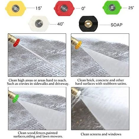 【5 buses de pulvérisation】 5 buses de pulvérisation pour nettoyeur haute pression: rouge -0 °, jaune -15 °, vert -25 °, blanc – 40 °, noir – 65 ° (savon). 2,5 GPM, prend en charge 4000 PSI.